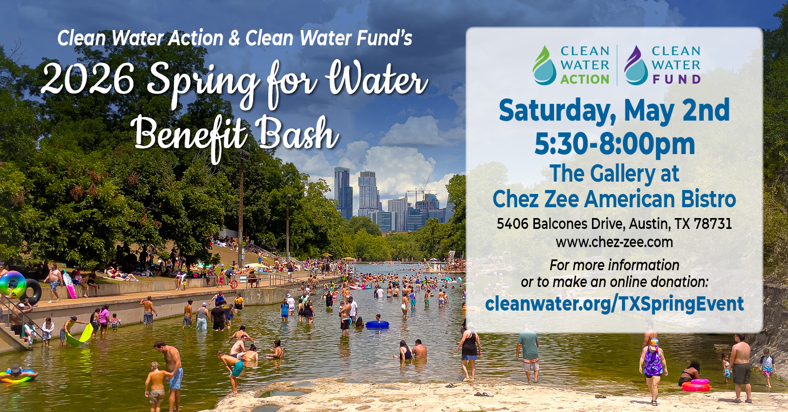 Join us IN PERSON at the delightful Chez Zee American Bistro on Saturday, May 2 from 5:30 to 8:00 p.m. for Clean Water Action and Clean Water Fund’s 2026 Spring for Water Benefit and Bash!