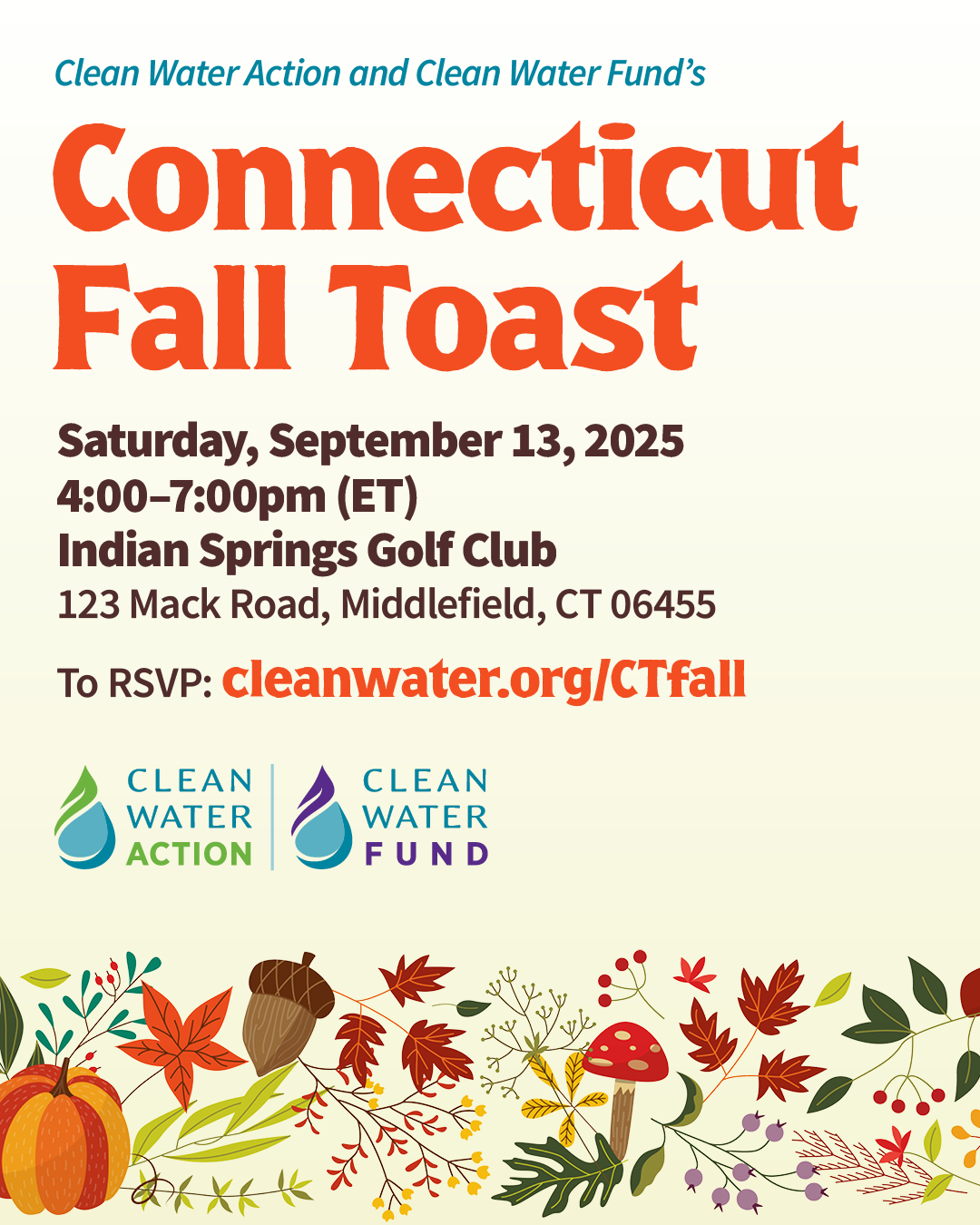 You're invited to Clean Water Action’s Connecticut Fall Toast! Our Connecticut organizing has been a bright spot in 2025. Come enjoy food and drinks with environmental and justice organizers at the beautiful Indian Springs Golf Club on Saturday, November 15th. Join us in welcoming new CT Director, Christine Bartlett-Josie and celebrating longtime CT Director, Anne Hulick.