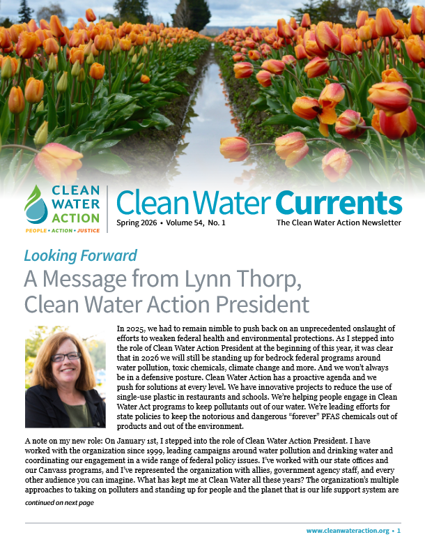 In 2025, we had to remain nimble to push back on an unprecedented onslaught of efforts to weaken federal health and environmental protections. As I stepped into the role of Clean Water Action President at the beginning of this year, it was clear that in 2026 we will still be standing up for bedrock federal programs around water pollution, toxic chemicals, climate change and more. And we won’t always be in a defensive posture. Clean Water Action has a proactive agenda and we push for solutions at every level. We have innovative projects to reduce the use of single-use plastic in restaurants and schools. We’re helping people engage in Clean Water Act programs to keep pollutants out of our water. We’re leading efforts for state policies to keep the notorious and dangerous “forever” PFAS chemicals out of products and out of the environment.