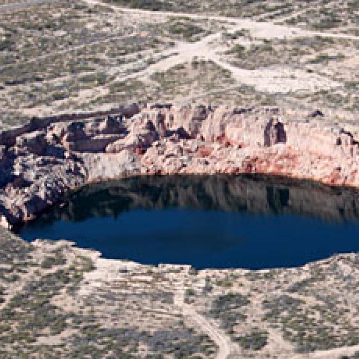 Wink Sink #2, Texas, 2011. Two large sinkholes formed in June 1980 and May 2002 near the communities of Wink and Kermit in western Texas. These “Wink Sinks” were 110 meters and 137 meters across at their formation, respectively, and have grown since then. They were caused by salt dissolution and collapse as a result of water movement through water wells supplying waterflooding operations.