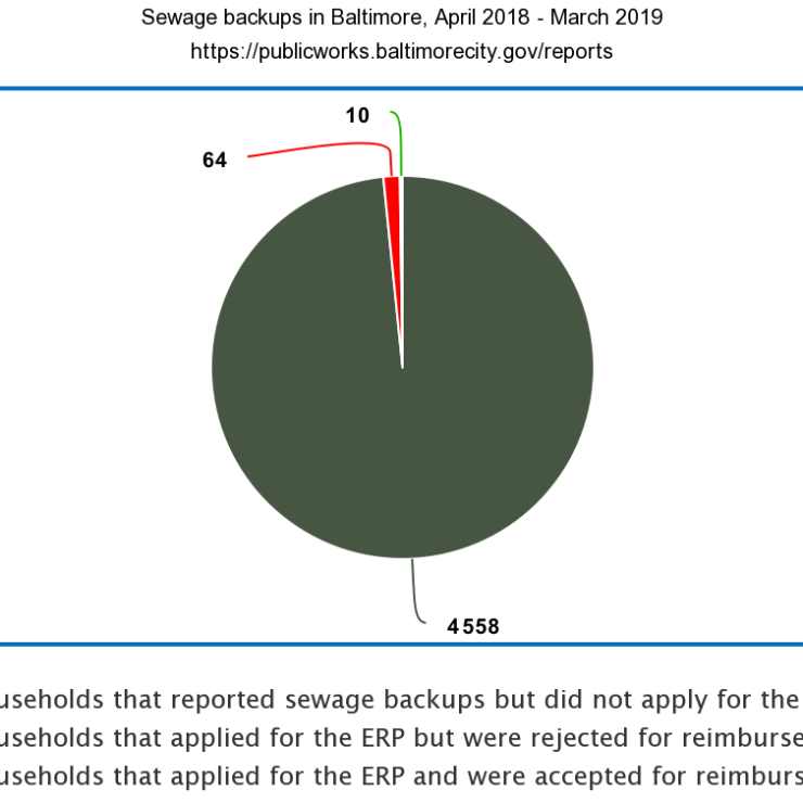 - In Quarter #5 (October-December 2018), no SSOs were eliminated, but the report shared that the City has approval for designs required to eliminate one, and had proposed plans to eliminate two more. A notice to process for construction was given for sewer collection system improvements in the North West area of Baltimore. The report noted that DPW was continuing to process applications to the Expedited Reimbursement Program, but did not provide any further information. At a public meeting in January, however, DPW employees shared with the press that 67 applications had been processed, and only 10 households had been reimbursed. 82% of the applications processed had been rejected - about a quarter of them rejected because the household did not call 311 within 24 hours of the backup occurring, and another quarter because DPW determined that the backup was not caused by rain.